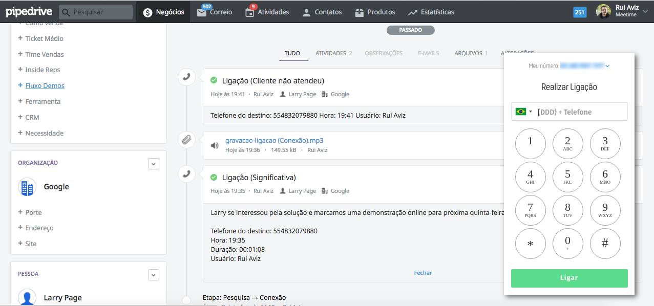 A integração com o CRM diminui o retrabalho e o preenchimento manual dos dados, dando ao vendedor tempo para focar no que mais importa: a venda em si. As ligações podem ser feitas de dentro do próprio CRM, clicando no botão de discagem: o número vem preenchido automaticamente para o dialer da Meetime.